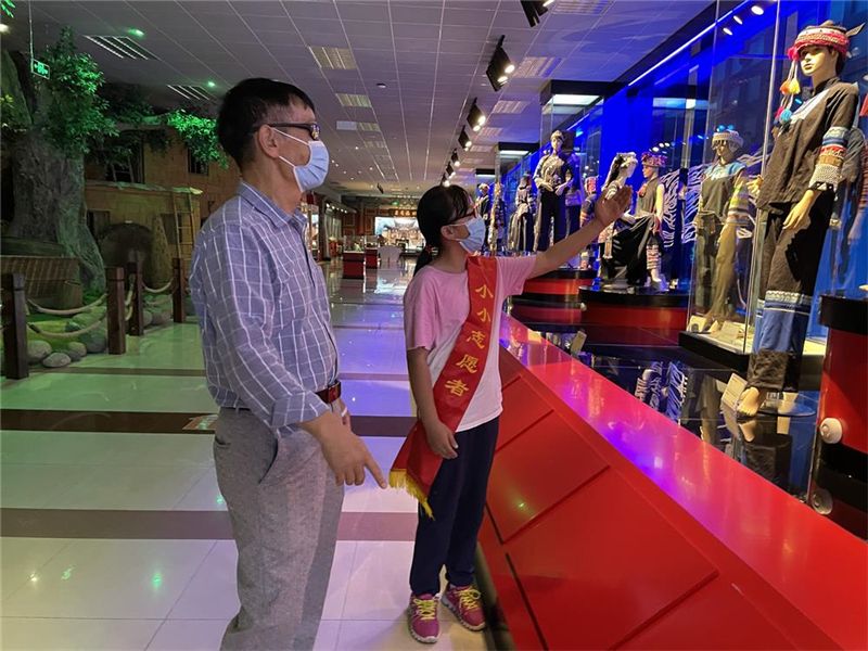 孩子们在服务中微笑地使用“你好”“请”“对不起”“谢谢”等礼貌用语,还积极主动地为观众分享关于鸡公帽的故事、过桥米线的传说等精彩的历史文化知识。孩子们的讲解和分享虽然浅显稚嫩,但是他们自信的神态,积极、敬业的服务态度深深感染着观众。他们在“蒙自人头盖骨”前想象先民的原始意趣,在生产生活用具前辨认千年前的生活细节,在绚丽多彩的民族服饰前体会少数民族对美好生活的向往,将社会实践服务与对家乡文化的了解紧密结合。