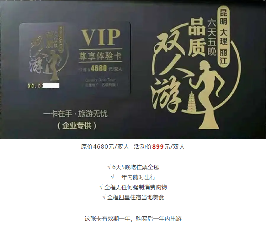 2021年8月21日,云南省文化和旅游厅综合执法监督局联合云南就爱去旅游文化传媒文旅大数据“游舆系统”监测到:899元限量抢购原价4680云南高品质旅游六天五晚双人游卡,昆明-大理-丽江六天五晚品质双人游