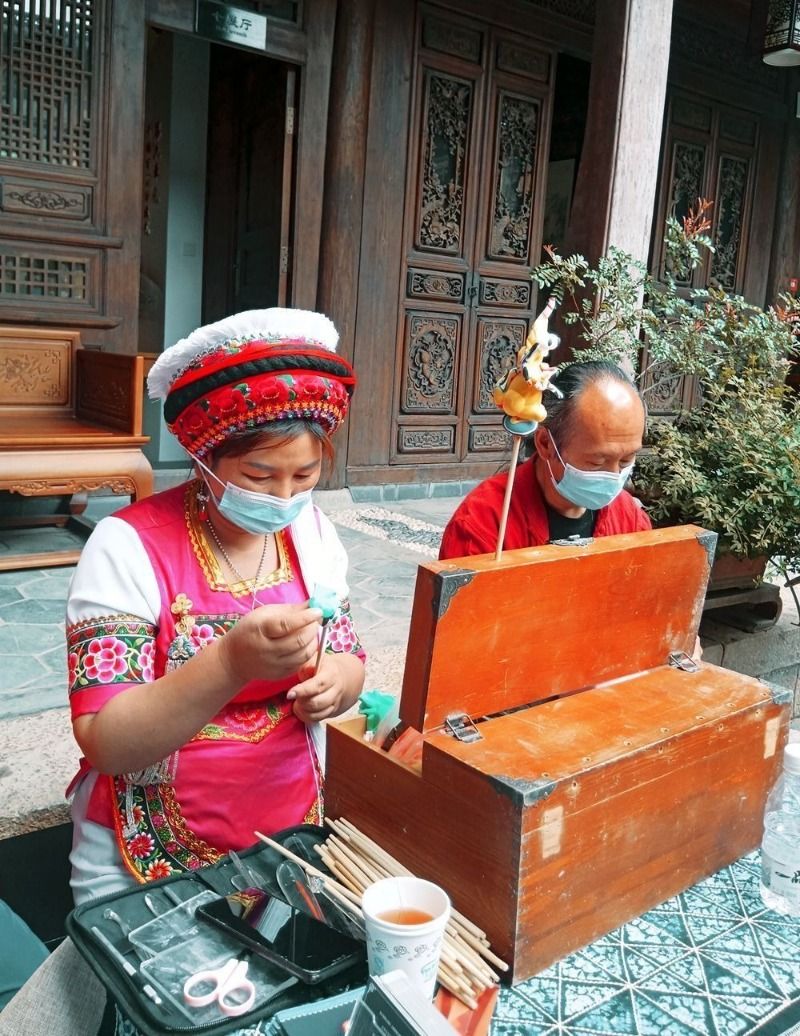 在活动现场,甲马省级代表性传承人张瑞龙、剪纸省级代表性传承人杨慧英、泥塑省级代表性传承人苏龙祥、白族扎染市级代表性传承人杨志瑞等非遗项目传承人为民众展示非遗技艺,与民众进行互动和体验交流。