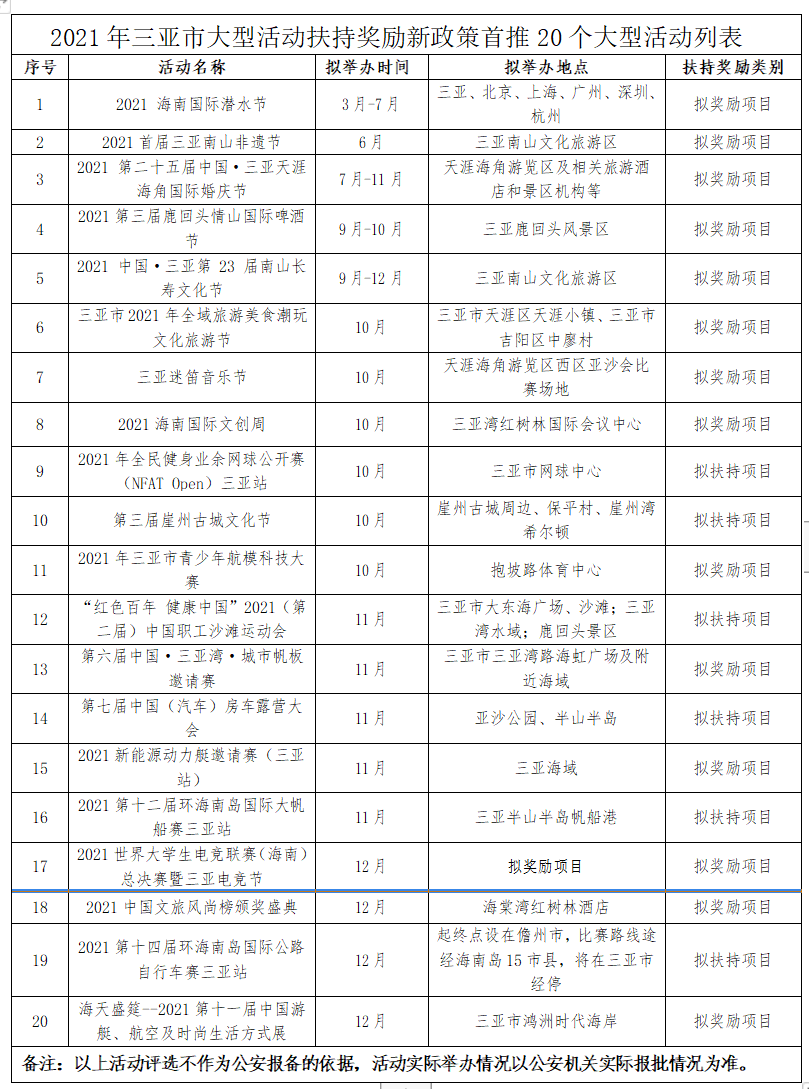 纳入扶持奖励范围的大型活动除了多届举办、逐渐形成三亚本土大型活动IP的崖州古城文化节、鹿回头情山国际啤酒节、天涯海角国际婚庆节、南山长寿文化节等,还有自带IP流量的三亚迷笛音乐节、中国文旅风尚榜颁奖盛典、2021世界大学生电竞联赛(海南)总决赛暨三亚电竞节等,同时新增引入了一批符合三亚旅游城市定位与发展需要、创意创新的大型活动,如第七届中国(汽车)房车露营大会、2021年三亚市青少年航模科技大赛、2021海南国际文创周、2021新能源动力艇邀请赛(三亚站)。