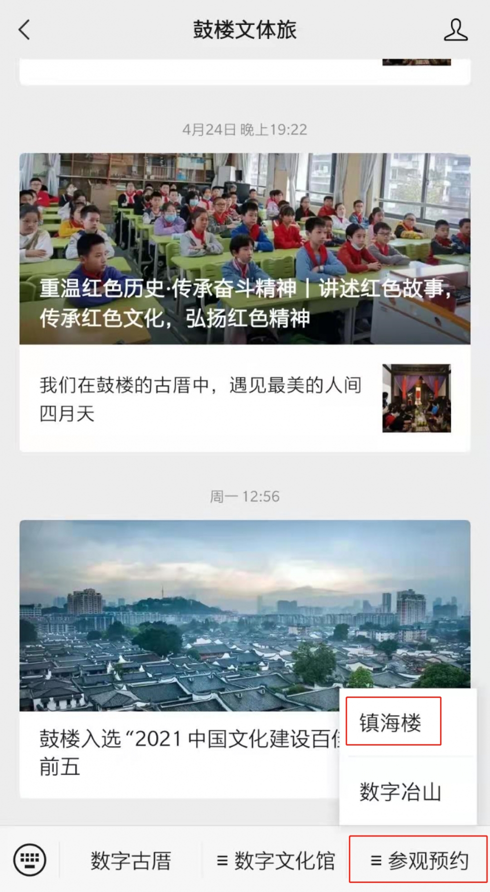 点击微信菜单栏右下方【参观预约】→【镇海楼】,进入页面填写相关信息后即可。