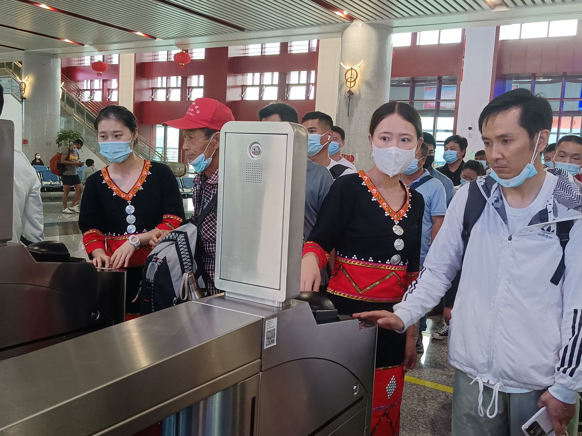 在南(宁)昆(明)客运专线沿线,旅客乘高铁出行到指定景区和酒店住宿可享受不同的折扣优惠。客运员还为旅客提供景点和交通衔接推介服务,赠送“金花”文创产品,营造祥和的节日氛围。