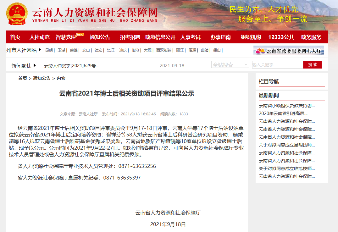 经云南省2021年博士后相关资助项目评审委员会于9月17-18日评审,云南大学等17个博士后站设站单位拟获云南省2021年博士后定向培养资助;崔祥芬等58人拟获云南省博士后科研基金研究项目资助,颜秉超等16人拟获云南省博士后科研基金优秀成果奖励,云南省地质矿产勘查院等10家单位拟设立省级博士后站,现予以公示。公示时间为2021年9月22-27日。如对评审结果有异议,可向省人力资源社会保障厅专业技术人员管理处或省人力资源社会保障厅直属机关纪委反映。