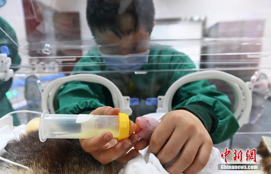 (8月4日育幼员在育幼室给大熊猫“宝宝”的二仔喂初乳。安源 摄)