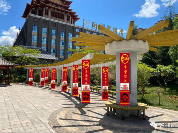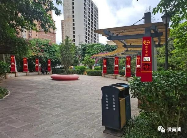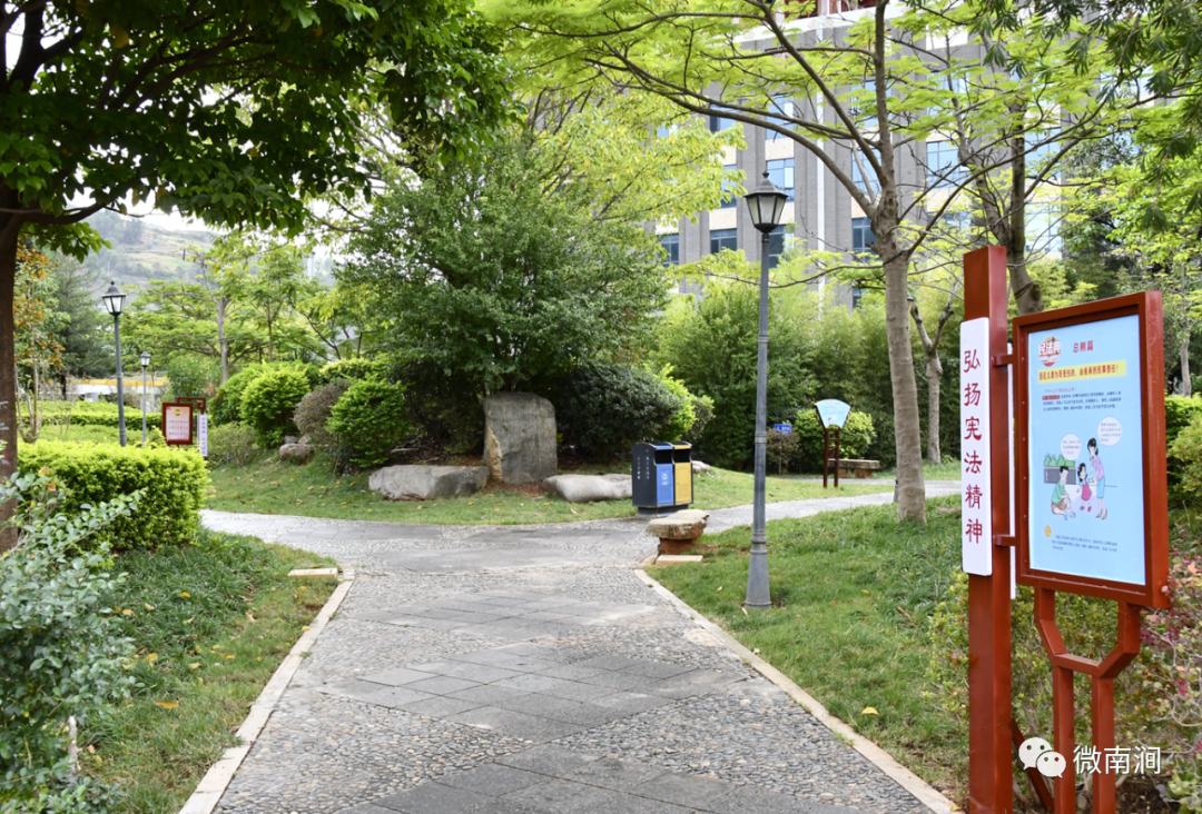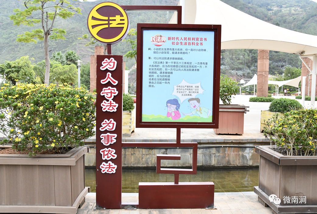 近日,南涧在不改变涧北公园原有景观的前提下,借助公园内已有的亭、廊、柱等载体,把法治元素与南涧文化元素相结合,建成了首个以法治为主题的公园,将法治文化“搬进”公园,融入群众的精神文化生活,让法在景中,寓法于景。