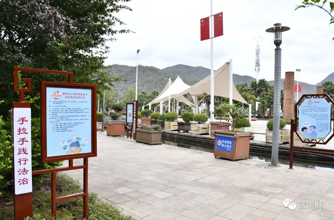 进入公园,沿着水系景观建立的是一幅幅图文并茂,以“社会生活百科全书”——《中华人民共和国民法典》为主的展板;水系景观走道边的小围墙上,用手绘动漫的方式展示了反诈骗、扫黑除恶、反邪教、禁毒防毒等知识;公园步道每个路口,都有展板分别展示了乡村振兴、疫情防控、生态环境保护等为主的法律法规知识。