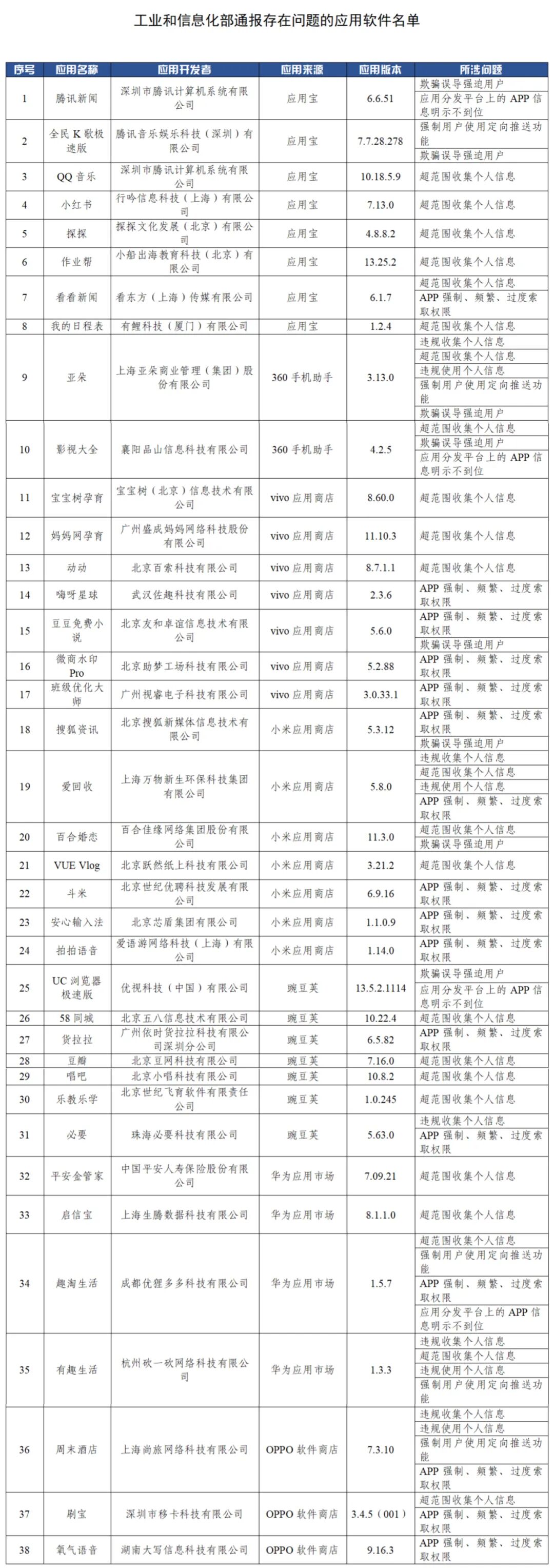 3日,工信部发布通报称,今年以来,工信部持续加大对APP侵害用户权益的整治力度,先后三次组织对重点问题开展“回头看”。前期,重拳整治了APP违规调用通信录、位置信息以及弹窗信息骚扰用户等问题。近期,针对用户反映强烈的APP超范围、高频次索取权限,非服务场景所必需收集用户个人信息,欺骗误导用户下载等违规行为进行了检查,共发现38款APP存在问题。上述APP应在11月9日前完成整改,逾期不整改或整改不到位的,工信部将依法依规进行处置并予以行政处罚。