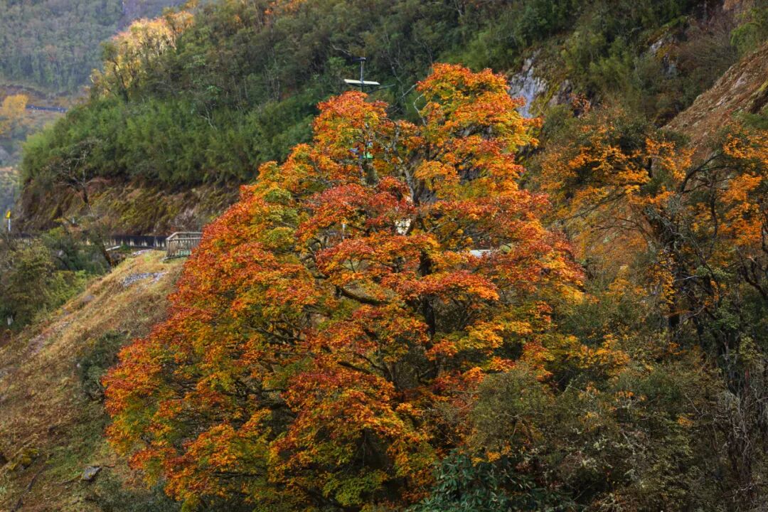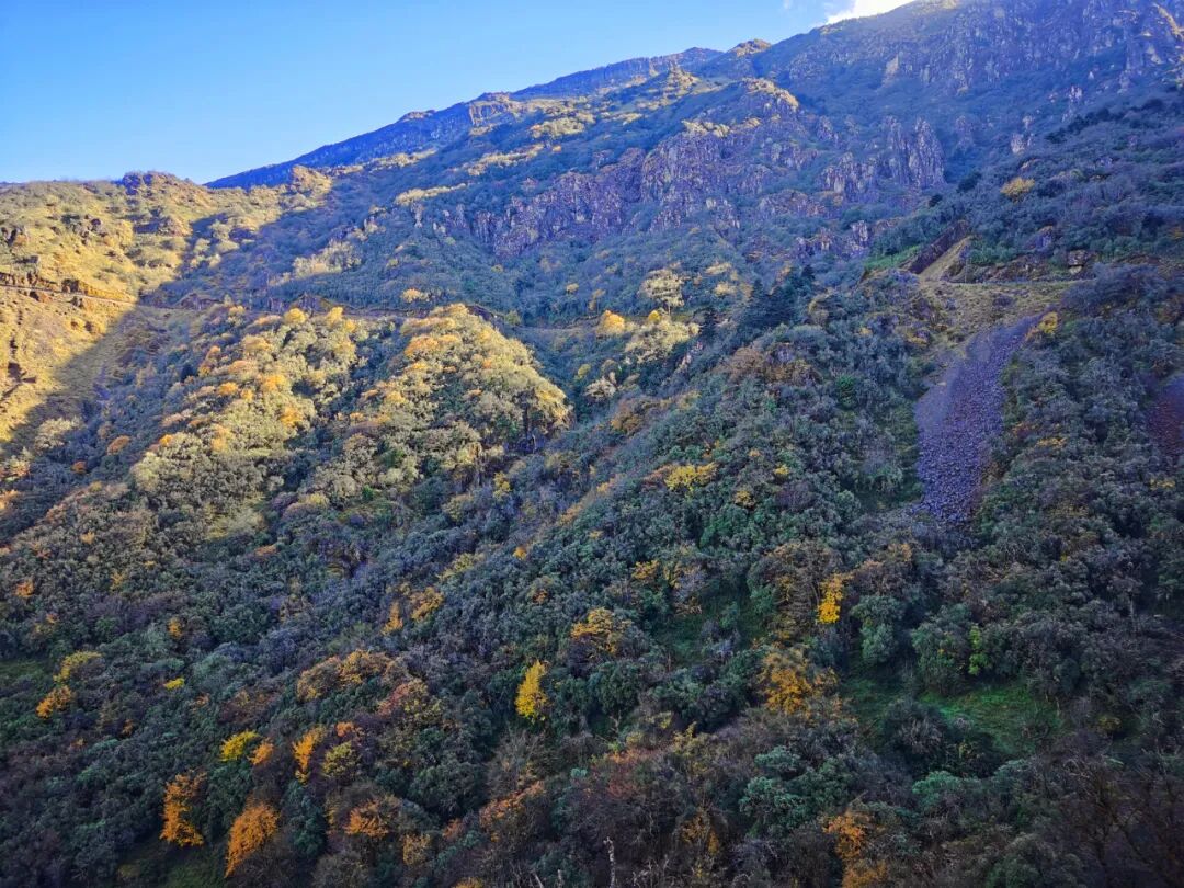 与蓝天白云,草木深黄,蓝花红花撞个满怀!