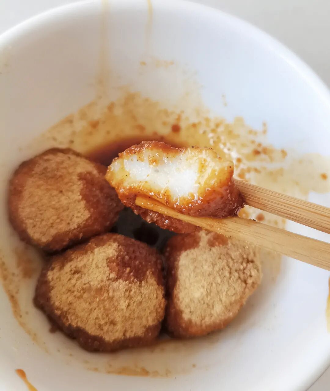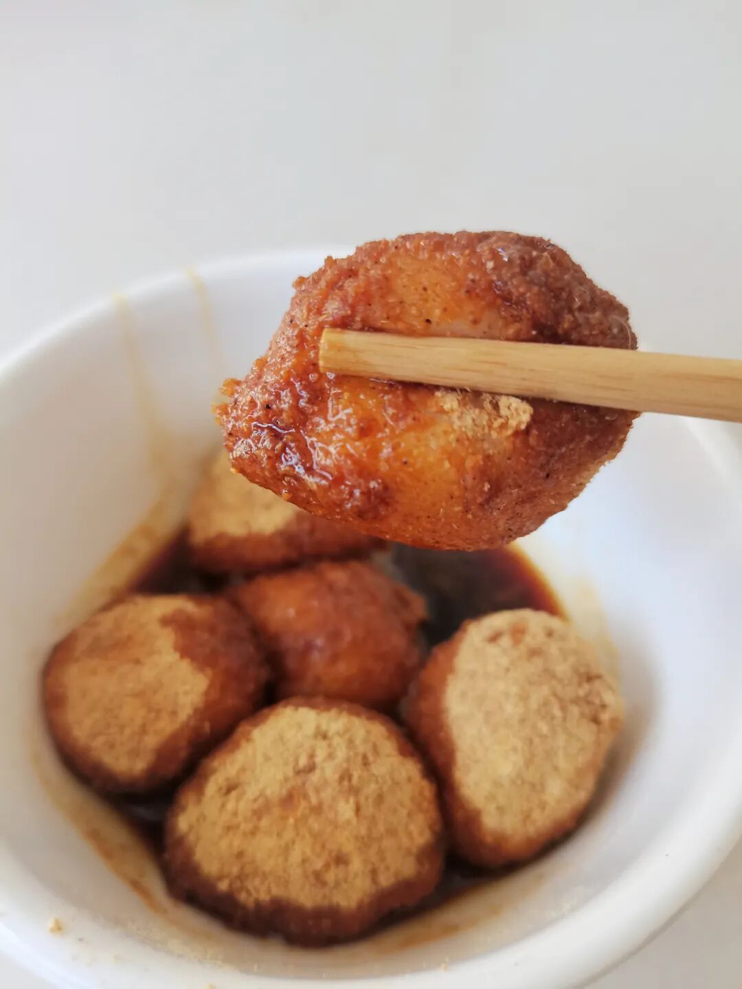 把揉好的面团搓成小圆球,放进沸腾的水中,裹上豆沫,浇上红糖水,就是一道极具通海风味的美食。