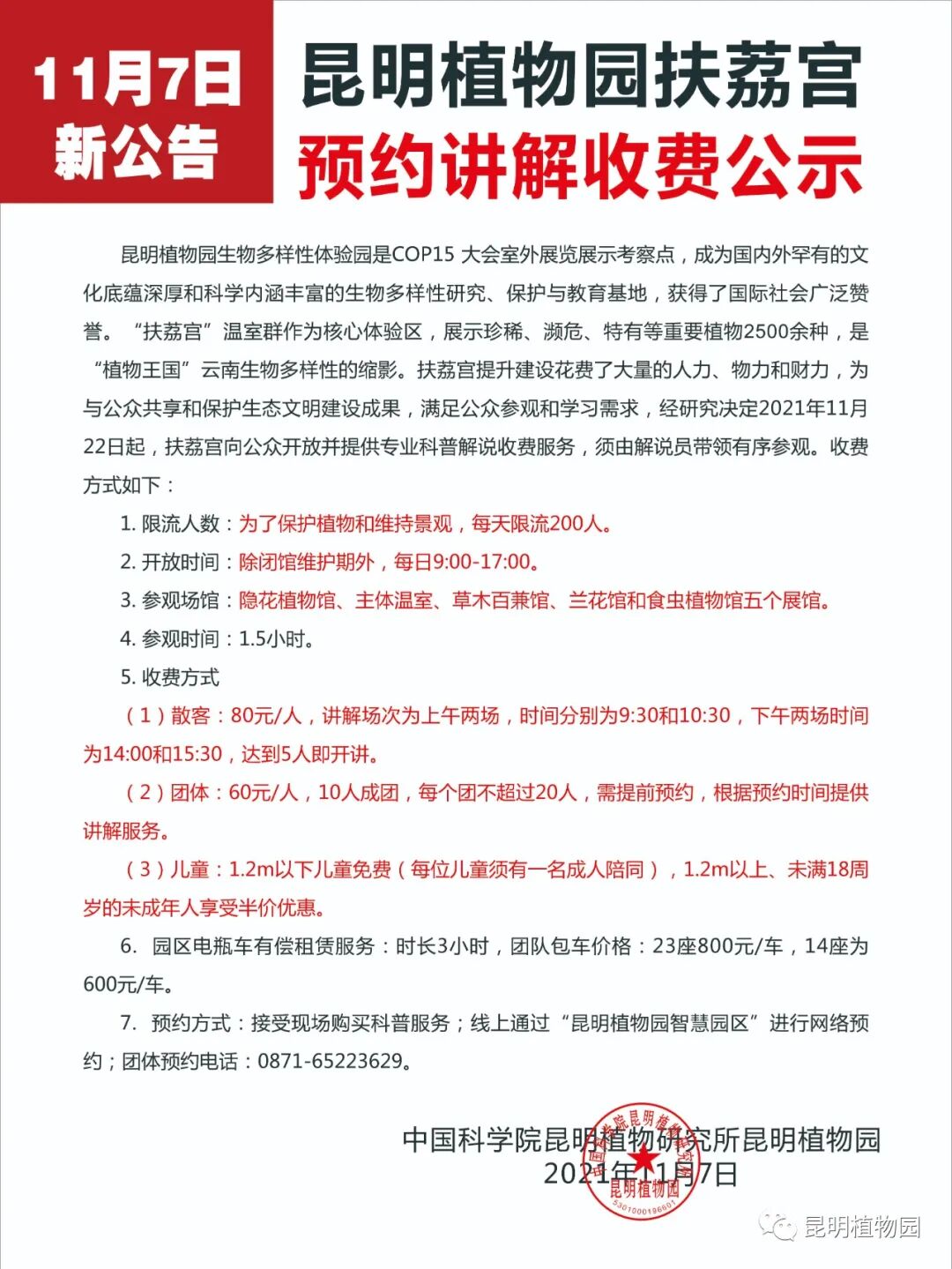 11月11日,昆明植物园微信公众号发布收费公示,自11月22日起,扶荔宫向公众开放并提供专业科普解说收费服务。收费方式为散客80元/人,团体60元/人,10人成团。