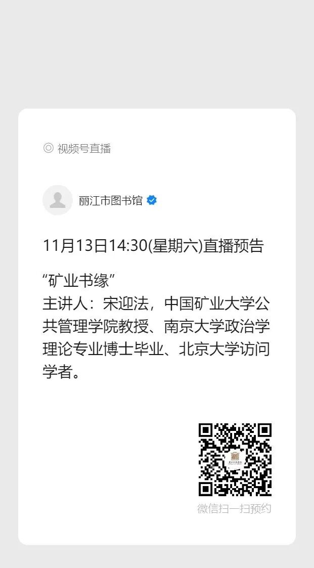 11月13日14:30—16:30,“天雨流芳”文化讲坛第42讲将在丽江市图书馆举行。中国矿业大学公共管理学院教授宋迎法将带来以“矿业书缘”为主题的讲座。