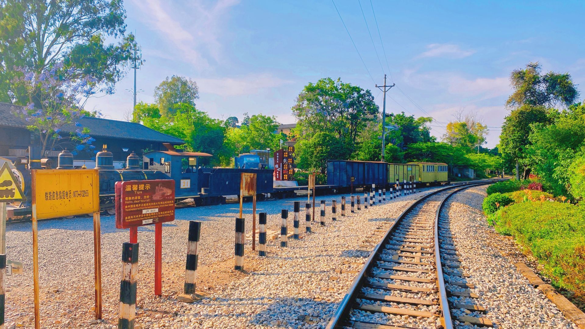 百年前修建这条铁路是以“一颗道钉一滴血、一根枕木一条命”的代价完成的。但也因为有了这条路,云南打开了闭关自守的大门,站边绿茵茵的香樟树也成了滇越铁路历史沧桑的见证者。