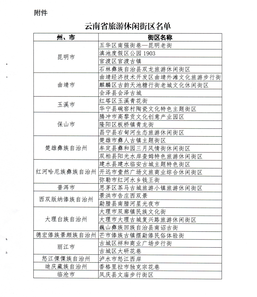 为贯彻落实党的十九届五中全会精神,落实《中华人民共和国国民经济和社会发展第十四个五年规划和2035 年远景目标纲要》,打造文化特色鲜明的旅游休闲街区,根据认定管理办法,经自评申报、州(市)初审推荐、现场检查和公示,现决定认定昆明市五华区南强街巷-昆明老街等30家街区为云南省旅游休闲街区。