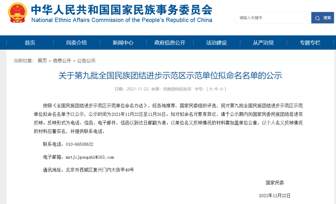 按照《全国民族团结进步示范区示范单位命名办法》,经各地推荐,国家民委组织评选,现对第九批全国民族团结进步示范区示范单位拟命名名单予以公示,公示时间为2021年11月22日至11月26日。如对拟命名对象有异议,请于公示期内向国家民委民族团结促进司反映。反映形式为电话、信函、电子邮件,信函以到达日邮戳为准。以单位名义反映情况的材料需加盖单位公章,以个人名义反映情况的材料应署实名,并提供联系电话。
