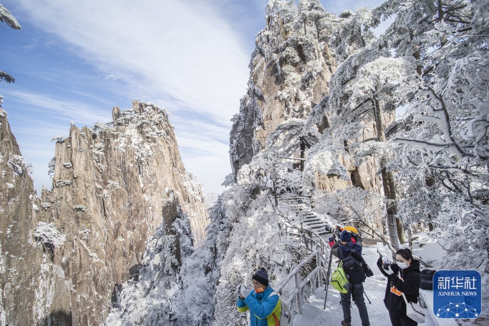 (11月22日,游人在安徽省黄山风景区观赏雪景。 施亚磊 摄)