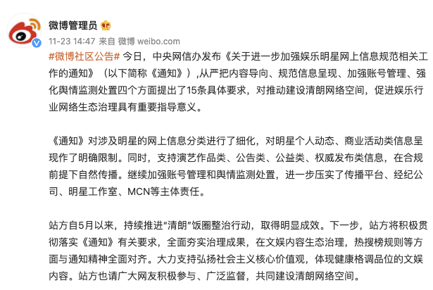 11月23日,新浪微博社区管理官方微博发布公告称,今日,中央网信办发布《关于进一步加强娱乐明星网上信息规范相关工作的通知》(以下简称《通知》),从严把内容导向、规范信息呈现、加强账号管理、强化舆情监测处置四个方面提出了15条具体要求,对推动建设清朗网络空间,促进娱乐行业网络生态治理具有重要指导意义。