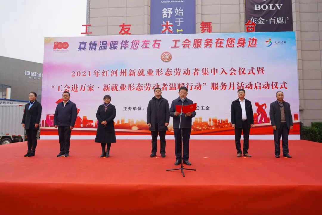 11月23日,红河州新就业形态劳动者集中入会仪式暨“工会进万家•新就业形态劳动者温暖行动”服务月活动启动仪式在蒙自市举行。州委副书记、州委统战部部长王刚出席启动仪式并宣布启动。