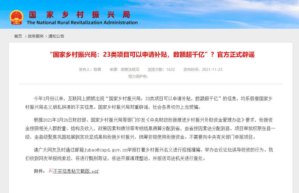 11月23日,国家乡村振兴局官方网站发布辟谣信息,全文如下: