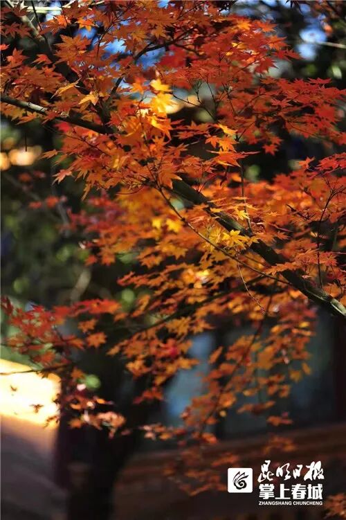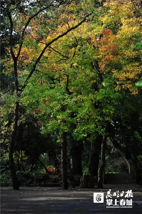 金殿名胜区除了历史文化悠久,还是昆明市园林植物园的所在地。景区内分布有12个植物专类园,拥有丰富的园林植物种质资源和品种繁多的彩叶季相树种。初冬时节,遍布园区的季相树种纷纷呈现出特有的绚丽色彩。除了鸡爪槭、银杏、红枫、枫香、石榴、紫薇、朴树等常见季相树种外,金钱松、落羽杉、池杉等珍贵的寒带树木在金殿园区内也有广泛分布。其中,以水景园片区景色最美,拍摄比赛之余,也是游客休闲打卡的好去处。