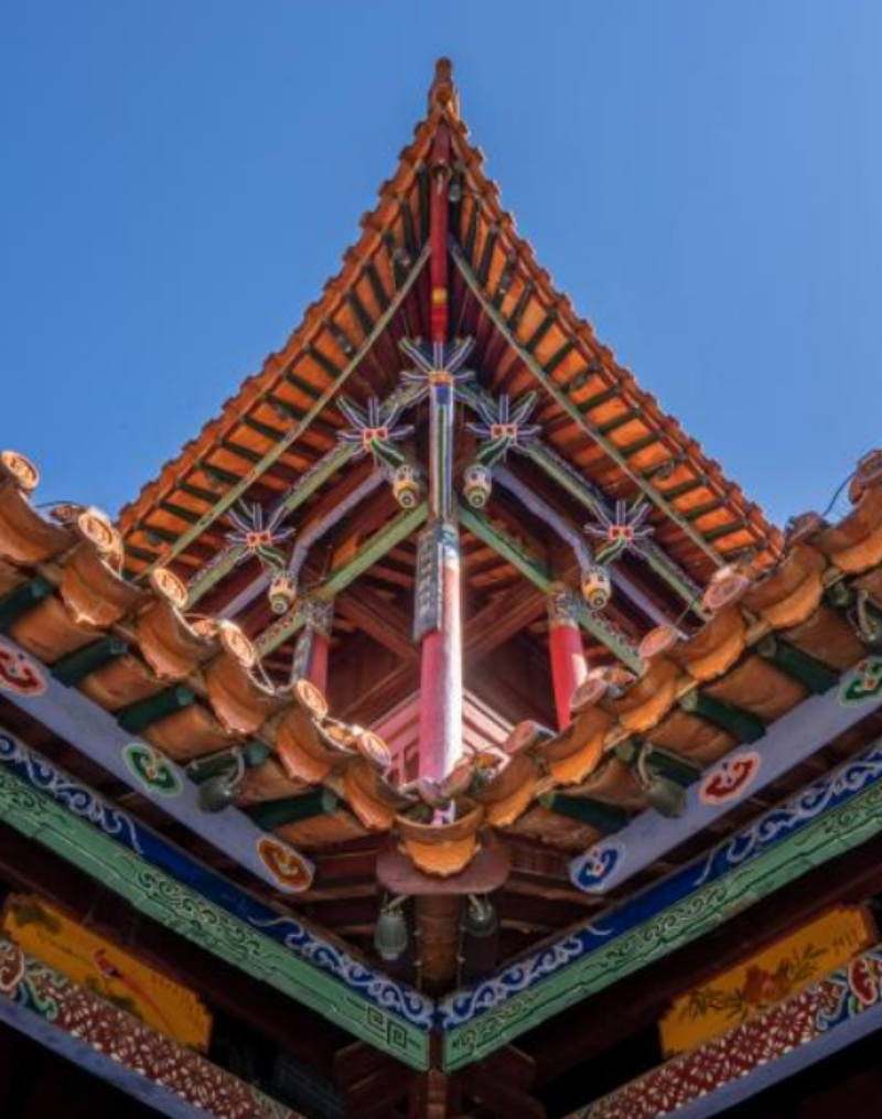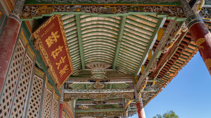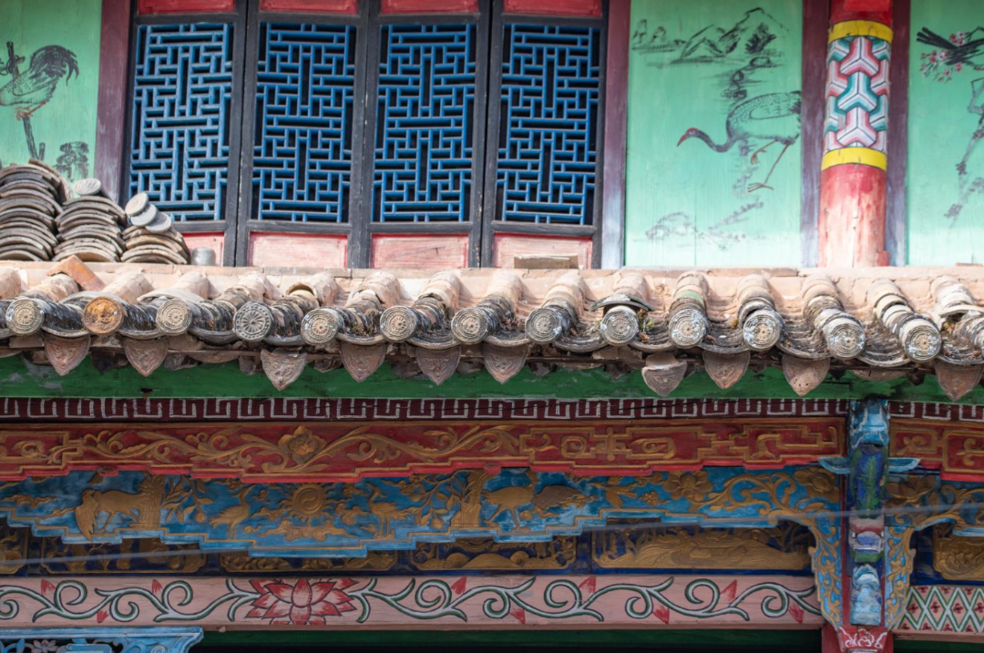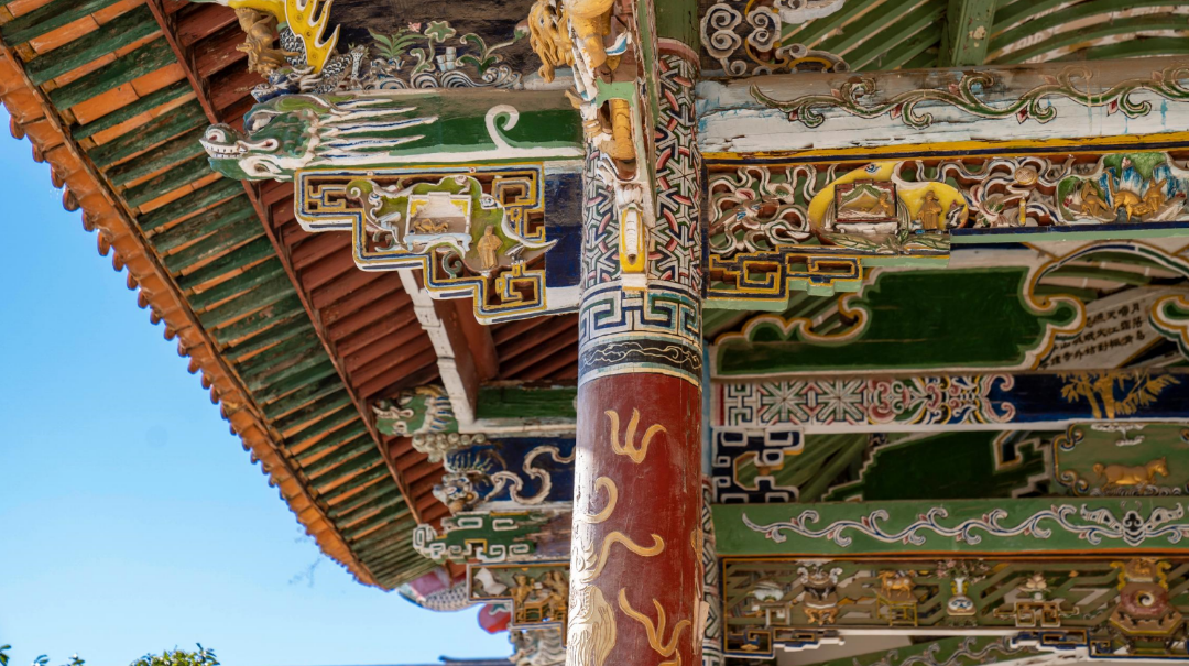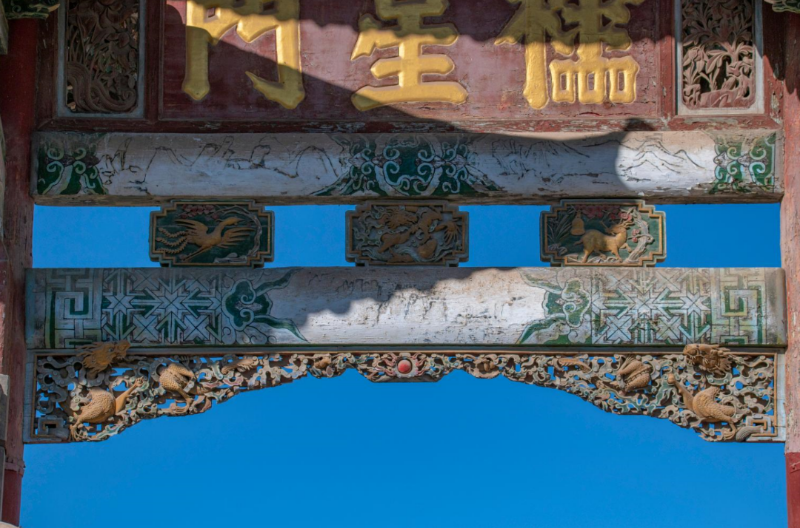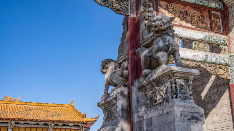 大成殿,为土木结构抬梁式构架,重檐歇山琉璃瓦顶,八个翼角上翘,明间和次间有20道雕有龙凤的格子门,檐枋雕有龙凤花鸟走兽,雕刻工艺精美。