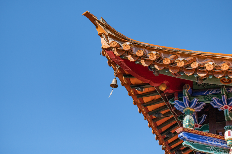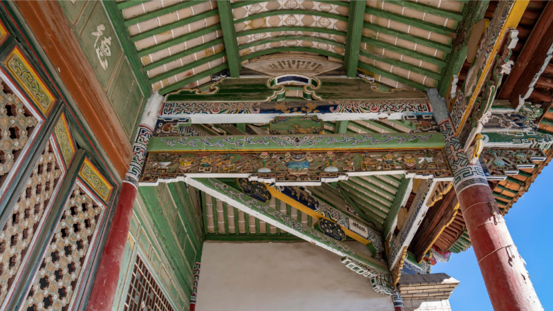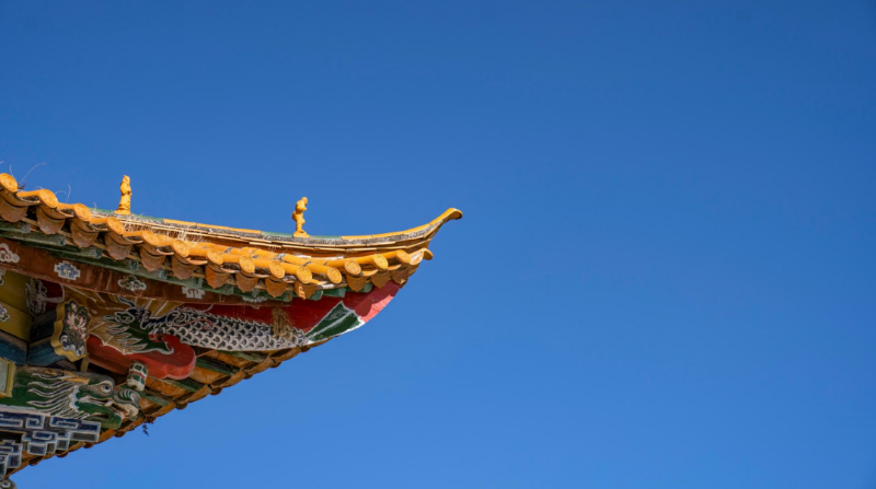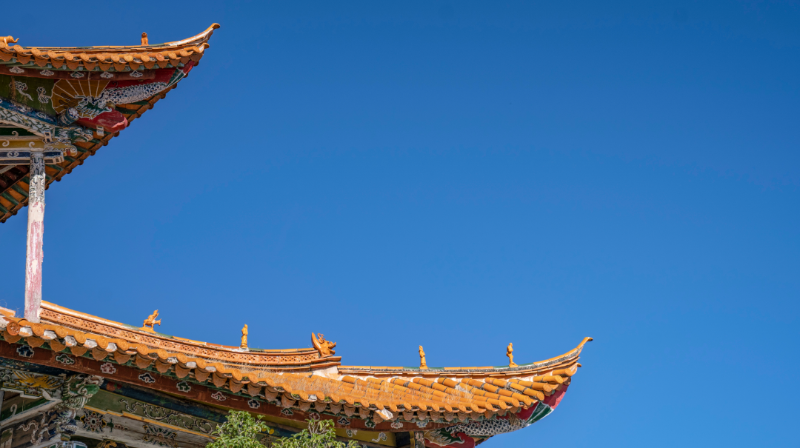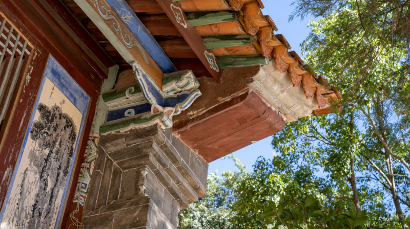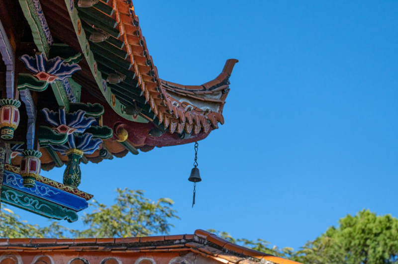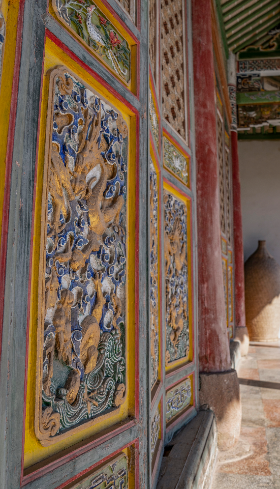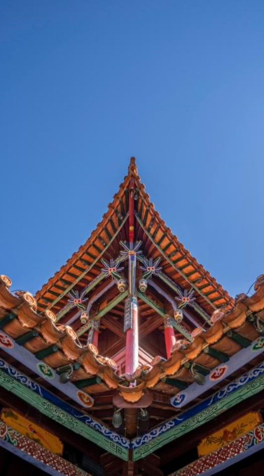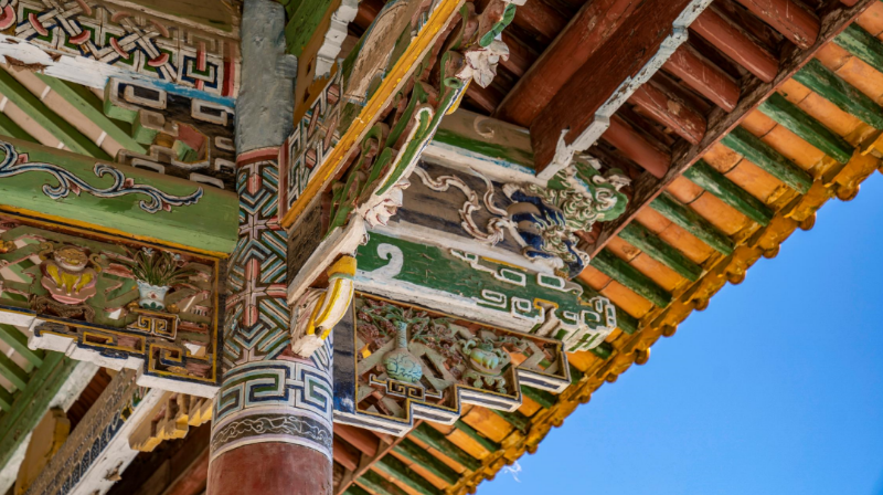 大成殿,为土木结构抬梁式构架,重檐歇山琉璃瓦顶,八个翼角上翘,明间和次间有20道雕有龙凤的格子门,檐枋雕有龙凤花鸟走兽,雕刻工艺精美。