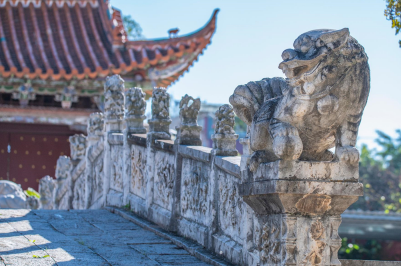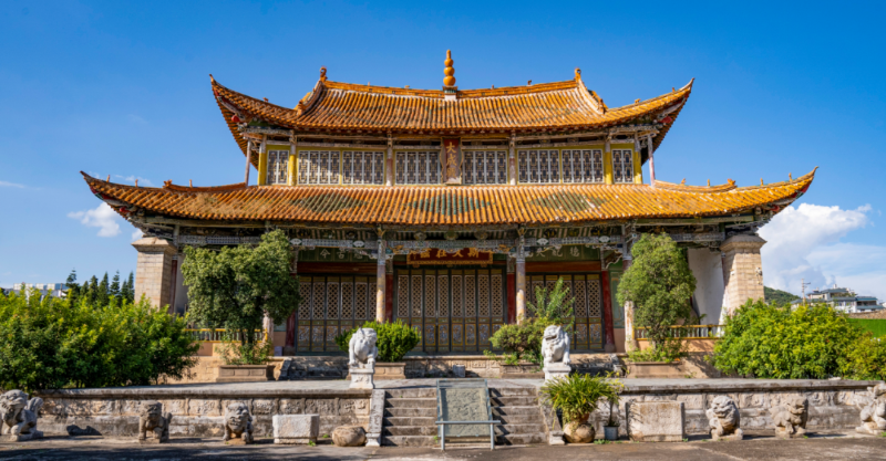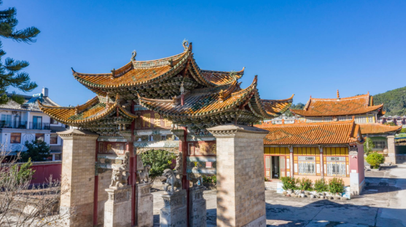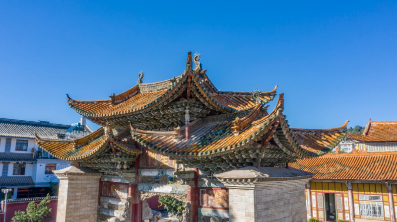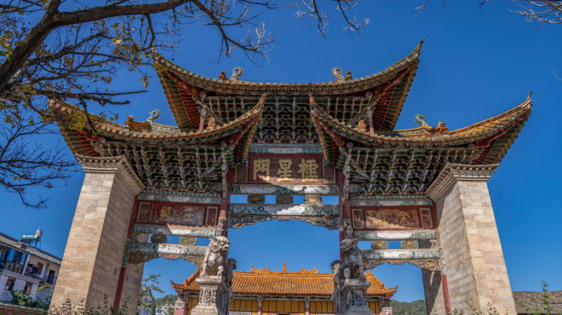 澄江文庙由大门、泮池、三孔石拱桥、棂星门、大成门、大成殿组成,全部建筑均建在一条南北向的中轴线上,现为云南省重点文物保护单位。