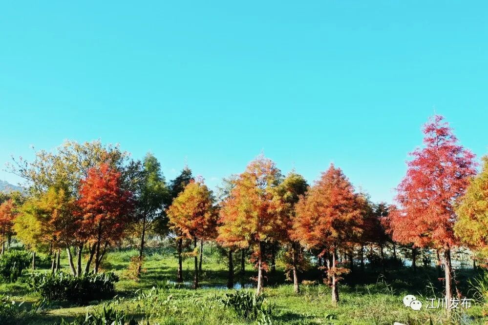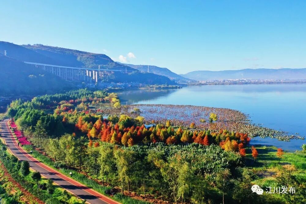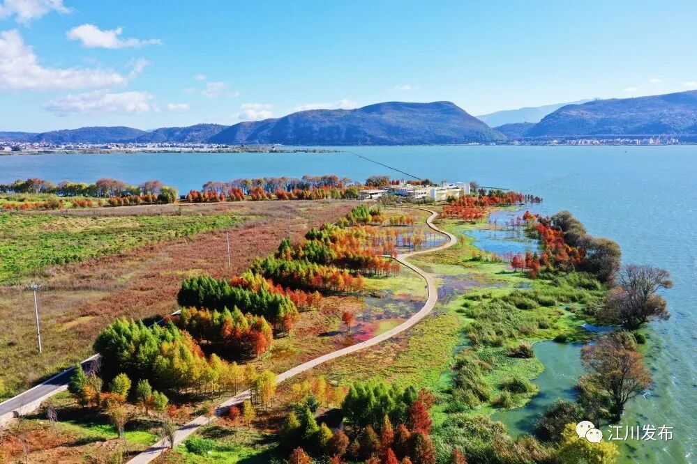初冬时节,玉溪市江川区星云湖沿岸成片的中山杉开始慢慢变红,衬托于蓝天之下、碧水之旁,格外醒目,也让星云湖多了一份浪漫和诗意。