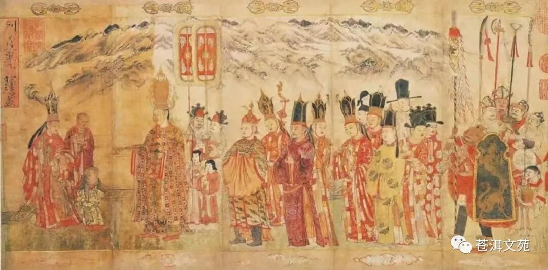 宋代《大理国》描工张胜温画《蛮王礼佛》图中,国王段兴智率妻子、群臣前去礼佛。