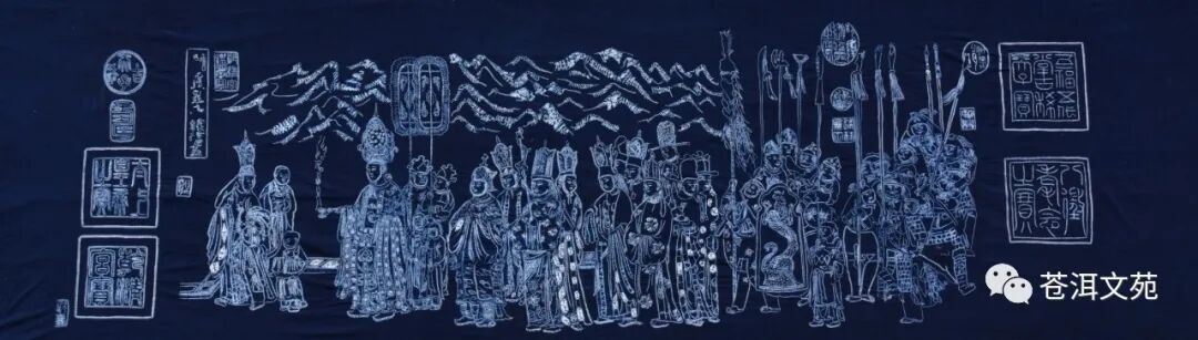 学术界认为,在文臣武将中,有两位武士头上戴的布冠套,同传统蓝底小团白花扎染纹样,就很相似。