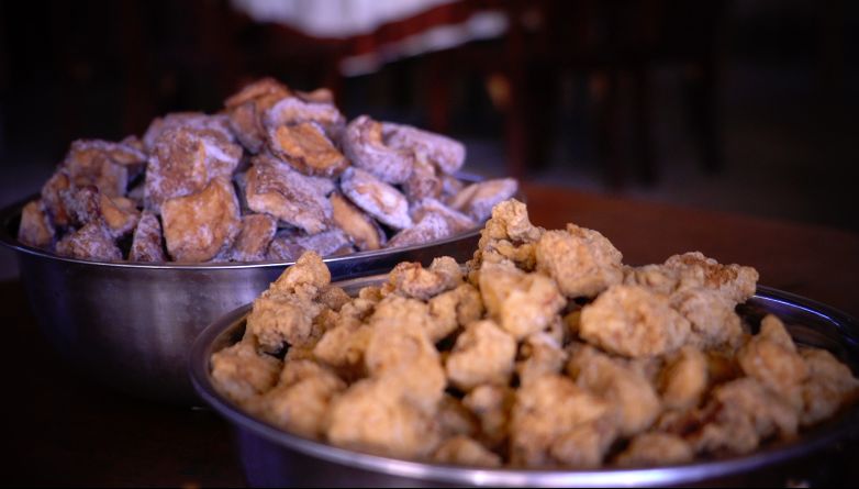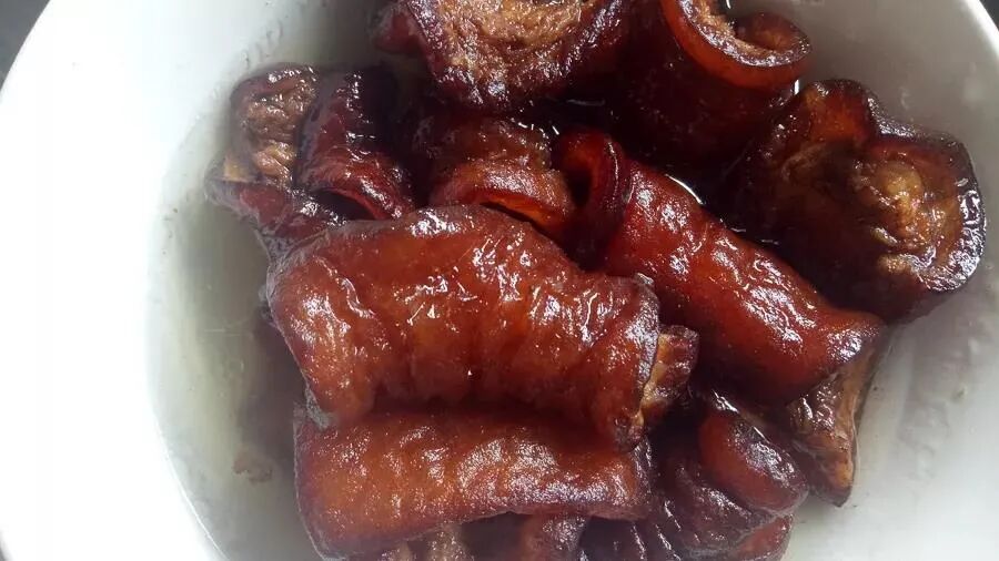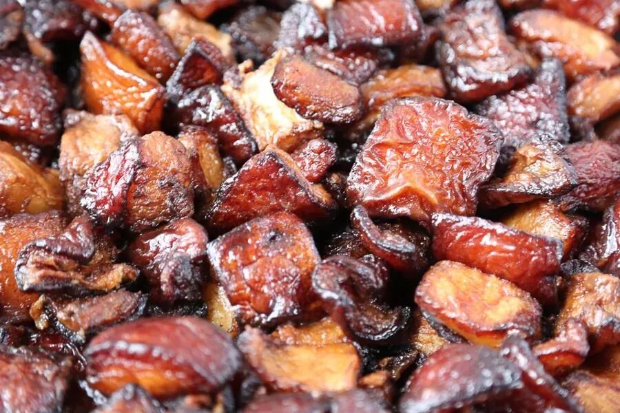 用上等的带皮五花肉,和蜂蜜、大蒜、生姜等材料一起,经过水煮、油炸、水泡等工艺加工而成,一直是宾川特有的名菜。