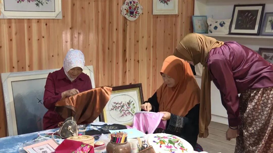 朱敏谦带着对“回绣”技艺的热爱,除了自己传承发扬,她还带动周边的绣娘一道将“回绣”不断发扬和创新,将她们擅长的针法和当地特有的珠绣手工技艺相结合,以传统图案与现代艺术相结合,经过设计、搭配色彩,手工制作了一批批富有特色、清秀简单却又不失典雅大方的绣品,将她们的爱好转化成了一种经济收入。