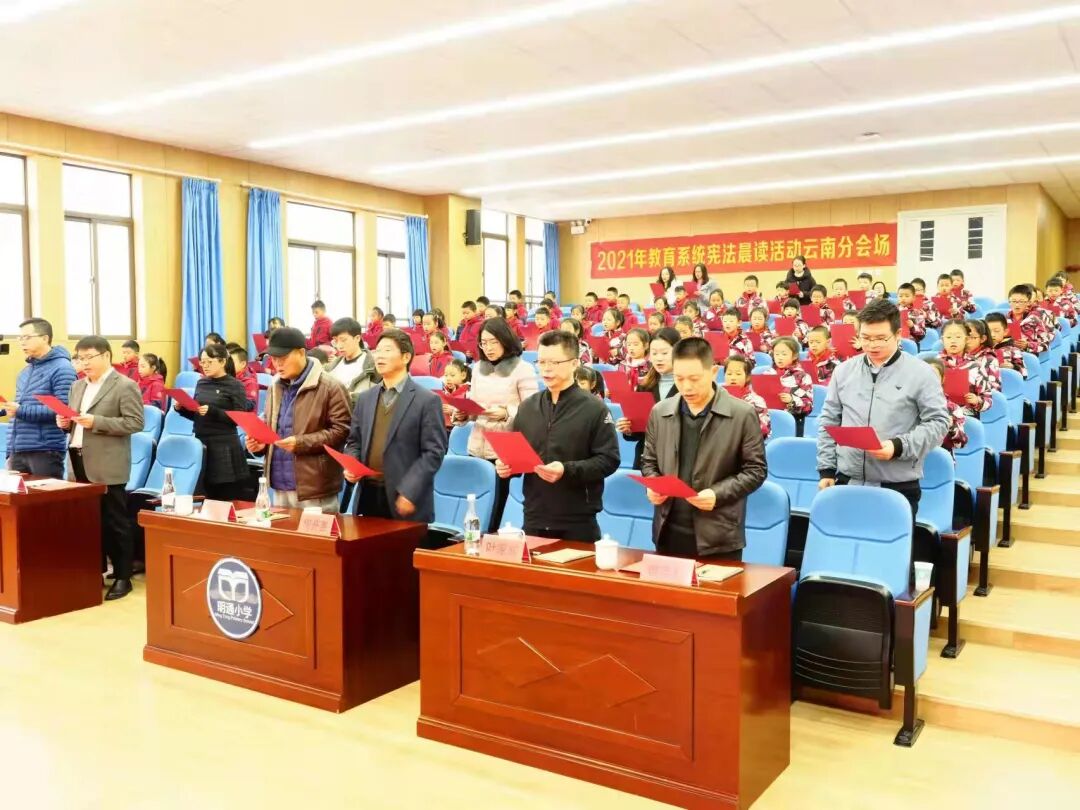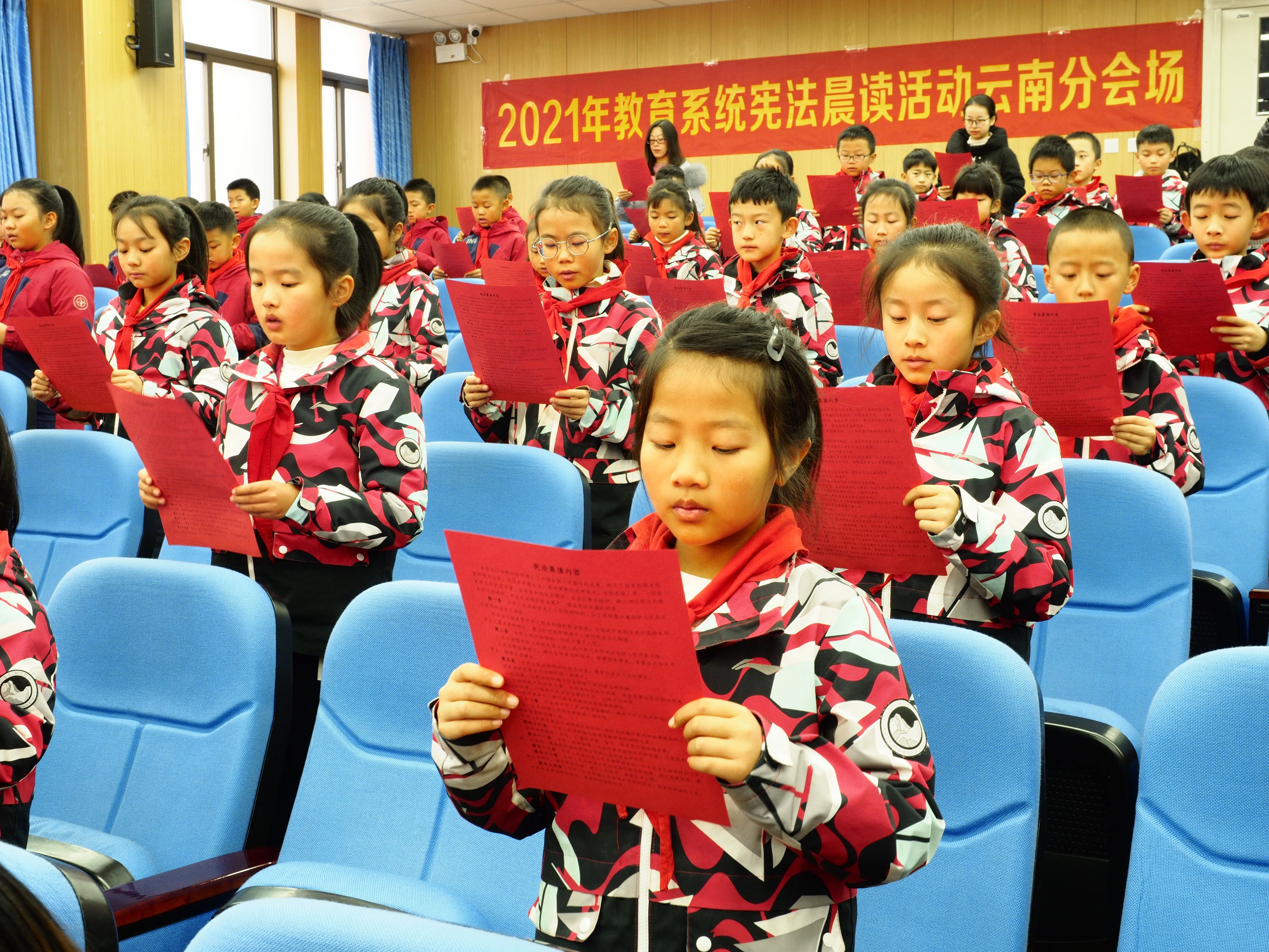 在第八个国家宪法日到来之际,2021年国家宪法日教育系统宪法晨读活动云南分会场设在明通小学。活动现场,省教育厅、省司法厅相关领导、工作人员与该校师生代表共同参与了晨读活动。