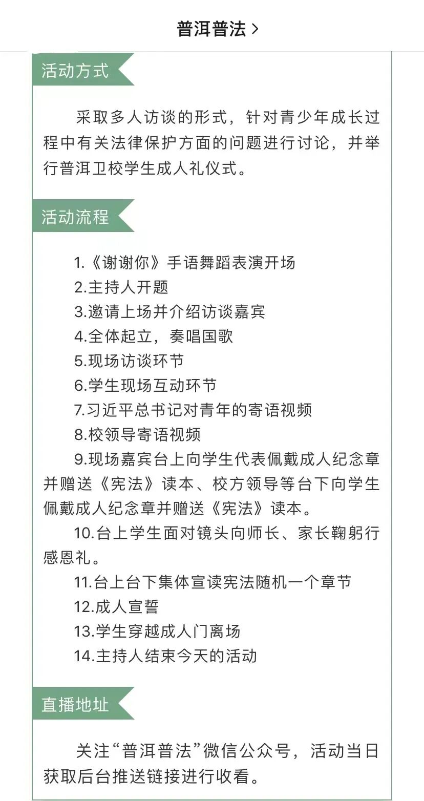 为开展好今年的“宪法宣传周”集中宣传活动,综合疫情防控等客观原因,普洱市针对青少年群体,采取线上访谈的形式开展一次市级宪法宣传示范活动。