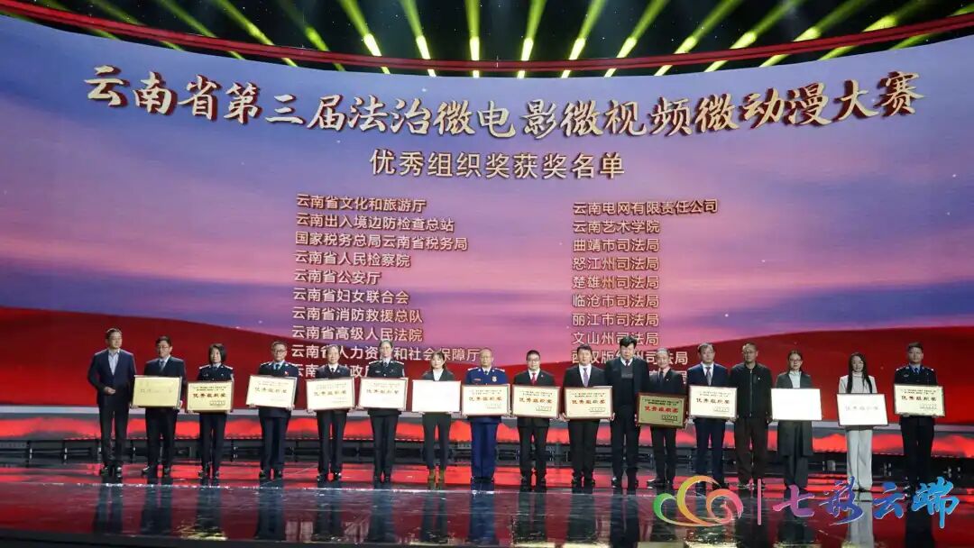 活动现场还为获得“云南省第三届法治微电影微视频微动漫大赛”优秀组织奖和一等奖作品奖的单位和个人颁奖。