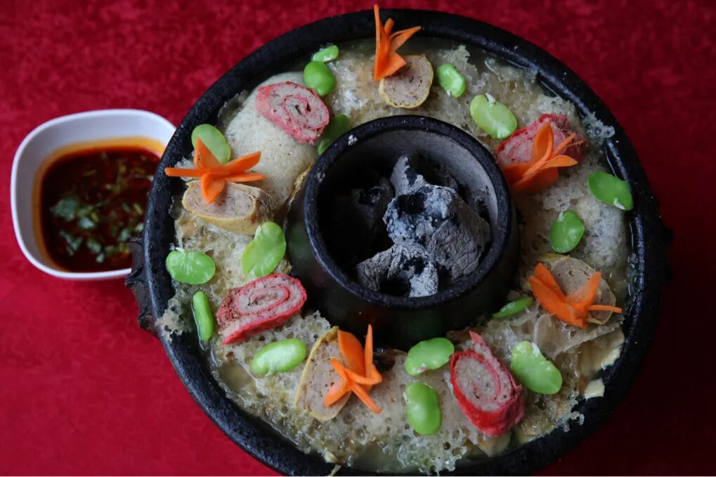 火瓢牛肉的“火”是指煮牛肉用的炭火,用炭火烹饪,突出了牛肉的香味和口感。而“瓢”指的则是煮牛肉用的铜瓢,这种用铜瓢代替铁锅烹饪,看着不仅有趣,而且铜瓢比铁锅传热更快,煮出的牛肉更美味鲜嫩。