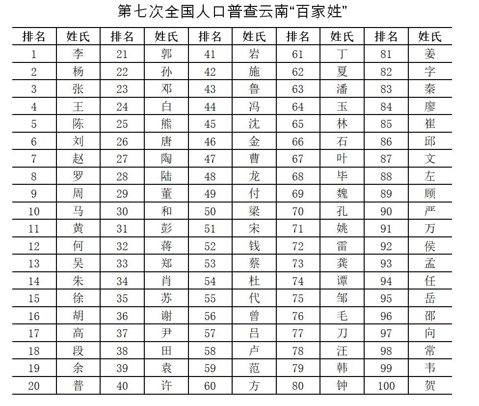 云南常住人口数量超过100万的姓氏分别为李(556.9万)、杨(364.4万)、张(291.6万)、王(281万)、陈(165.2万)、刘(146.8万)、赵(124.8万)、罗(102.8万)。其中“李”姓更是以超过500万的人数位居姓氏排名之首。