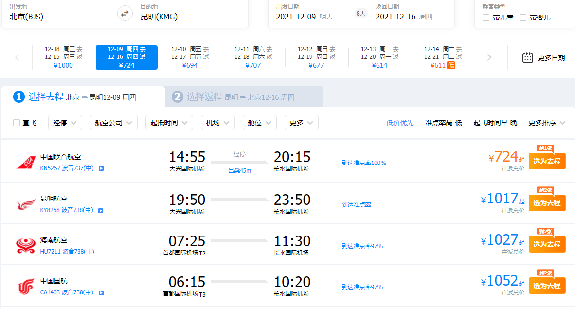 从行程上看,北京至昆明出发时查询的往返机票价格最低为724元。