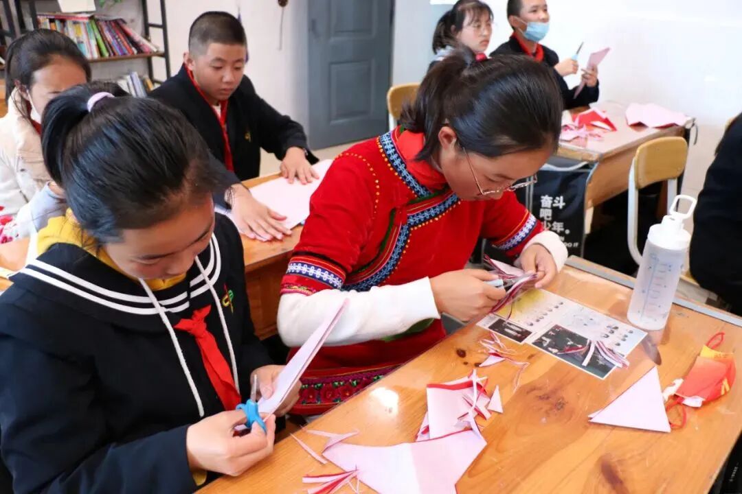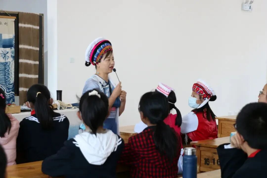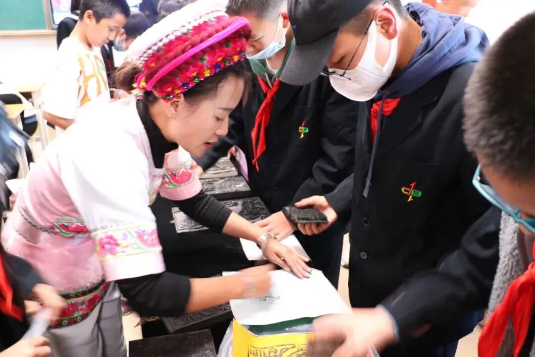 此次活动有白族面塑、白族剪纸、白族扎染、白族甲马、白族民居彩绘五个非遗项目技艺体验劳技课。课堂上,5名省级或州级非遗传承人作为教师讲解非遗项目知识及技艺实操,同时每个班配备1-2名非遗传承人的徒弟,指导学生完成非遗作品的学习创作。