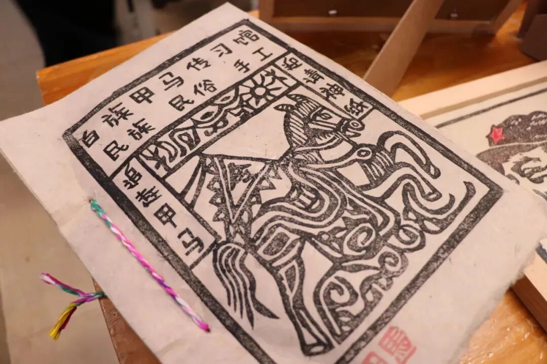 “白族甲马纸的制作方法并不难,先将文字和图案用反笔写在木板上,然后进行精工雕刻,最后在刻绘的文字和图案上刷以各种自制的颜料,再将刷好颜料的文字和图案套印在手工制作的‘土纸’上。”非遗传承人一边印制甲马,一边向围观的同学们介绍着……