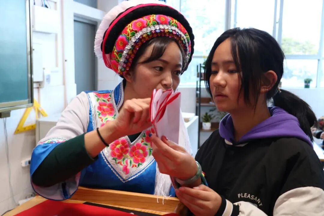12月3日,下关一中初中部把非遗技艺搬进课堂,联合大理州非物质文化遗产保护中心、大理州群众艺术馆,通过开展“全民艺术普及·多彩非遗技艺进校园”活动,把非遗文化与校园文化相融合,让同学们了解白族特色传统技艺,丰富知识的同时,播下非遗传承和保护的“种子”。
