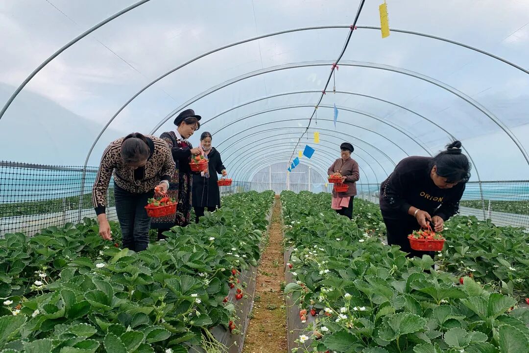 走进润东生态草莓园的种植大棚内,只见一排排草莓已经开始挂果成熟,待人采撷,红色饱满的果实在绿叶的映衬下显得愈发娇艳欲滴。凑近草莓,阵阵清香扑鼻而来,形美味甜的草莓,个个色泽鲜红、圆润饱满。当地群众和游客们正挎着小篮子穿行在垄沟间,开心地体验采摘的乐趣,尽情享受冬日里的“莓”好时光。