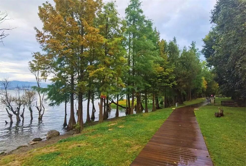 慢行步道、自行车道、栈道、石头小道、长椅及高低错落的沙滩、湿地、坡地、草坪、花海、灌木林……洱海生态廊道,有丰富的生态景观体验,同时也是游客和附近居民重要的日常活动空间。