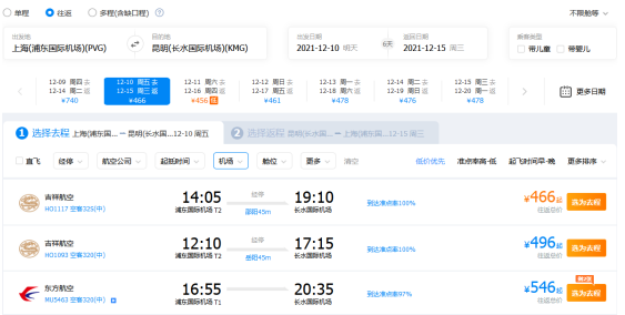 从行程上看,上海至昆明出发时查询的往返机票价格最低为466元。