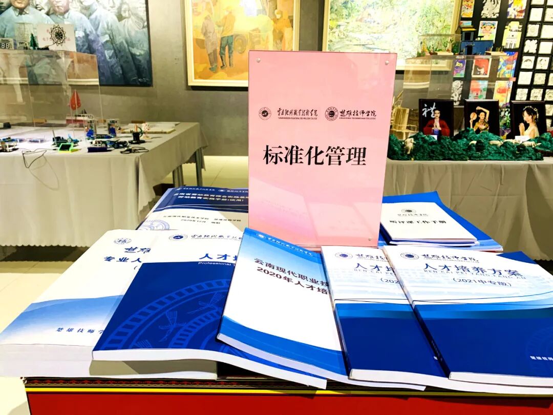 此次风采展中,云南现代职业技术学院 楚雄技师学院通过书画作品、校本教材、规范化管理手册、模型、师生手工作品等,全面展示了学院在践行初心使命、教育教学、校企合作、社会培训、服务楚雄州战略、对外合作交流等方面取得的成绩及在专业建设、人才培养、服务社会等方面的成果。