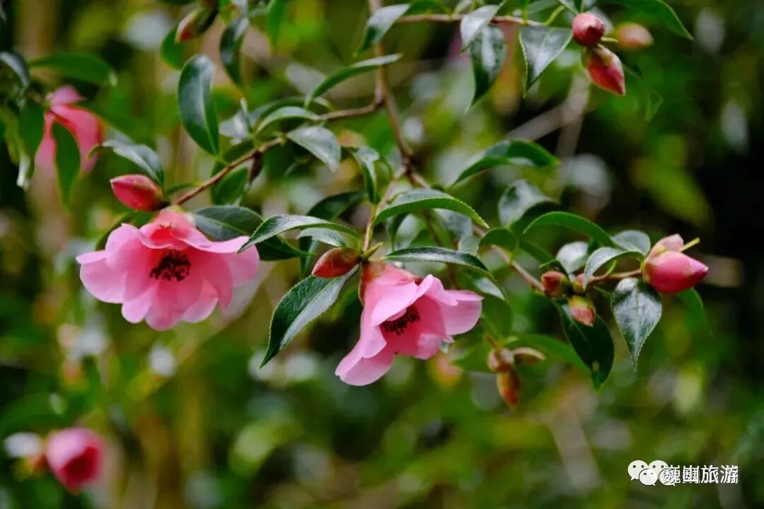开得最热闹的,要数山路边的野山茶了。一丛丛野生山茶在蓝天白云、青山碧水间争相斗艳,苍翠的野山茶树上,粉红的茶花灿然开放,充满生机,各种姿态美不胜收,给隆冬里的山谷增添了丝丝暖意。有风吹过的时候,一株株山茶在风中摇曳,不一会儿,路边的草地上便铺上了一层薄薄的花瓣,让人有种忍不住想躺在上面小憩片刻的想法。