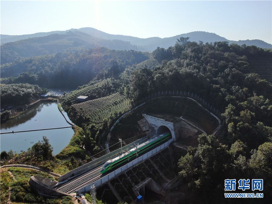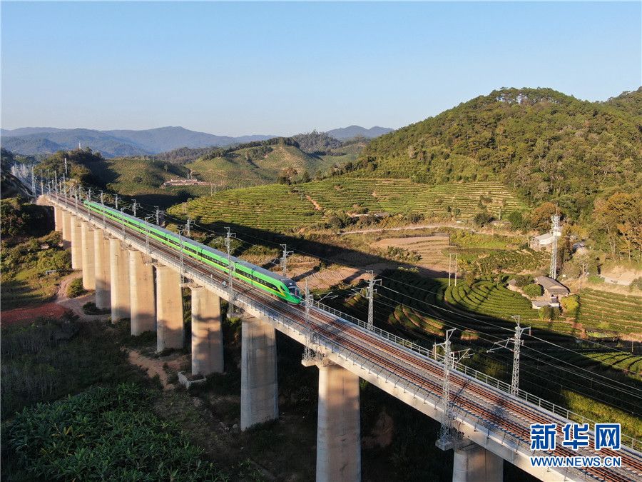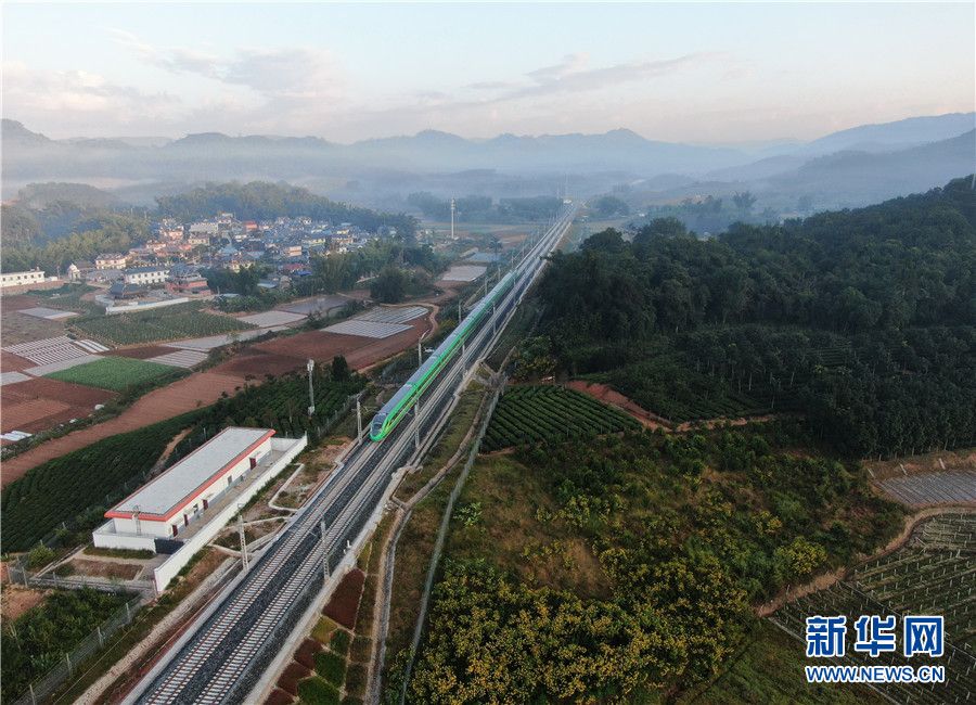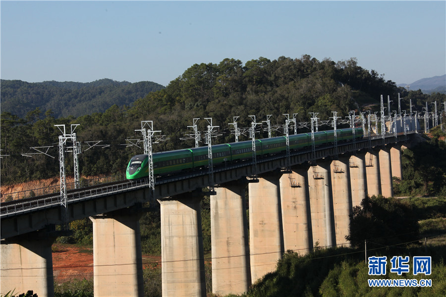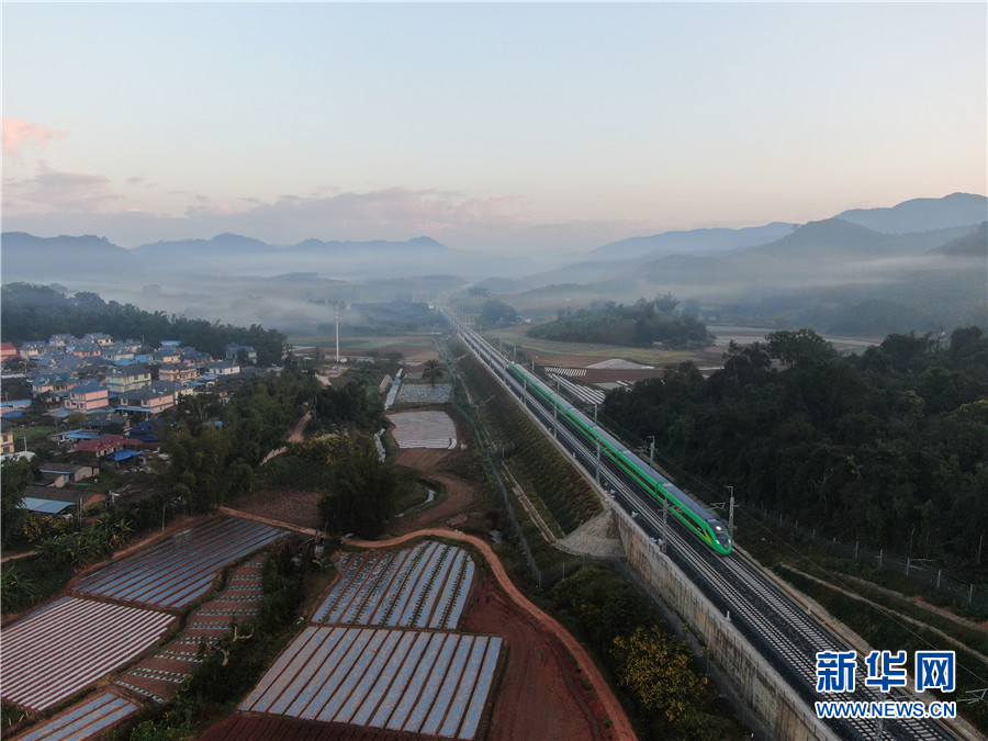 (12月8日,一列动车在云南省西双版纳傣族自治州境内的中老铁路路段上飞驰。)