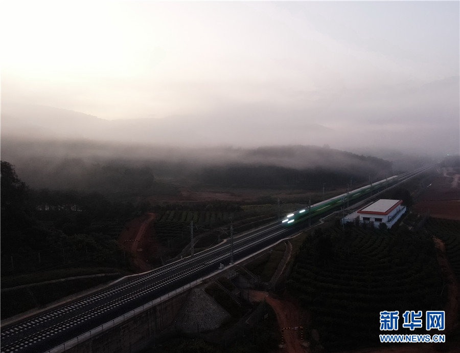 (12月9日,在云南省西双版纳傣族自治州境内的中老铁路路段上,一列动车穿越晨雾飞驰而来(无人机照片)。)