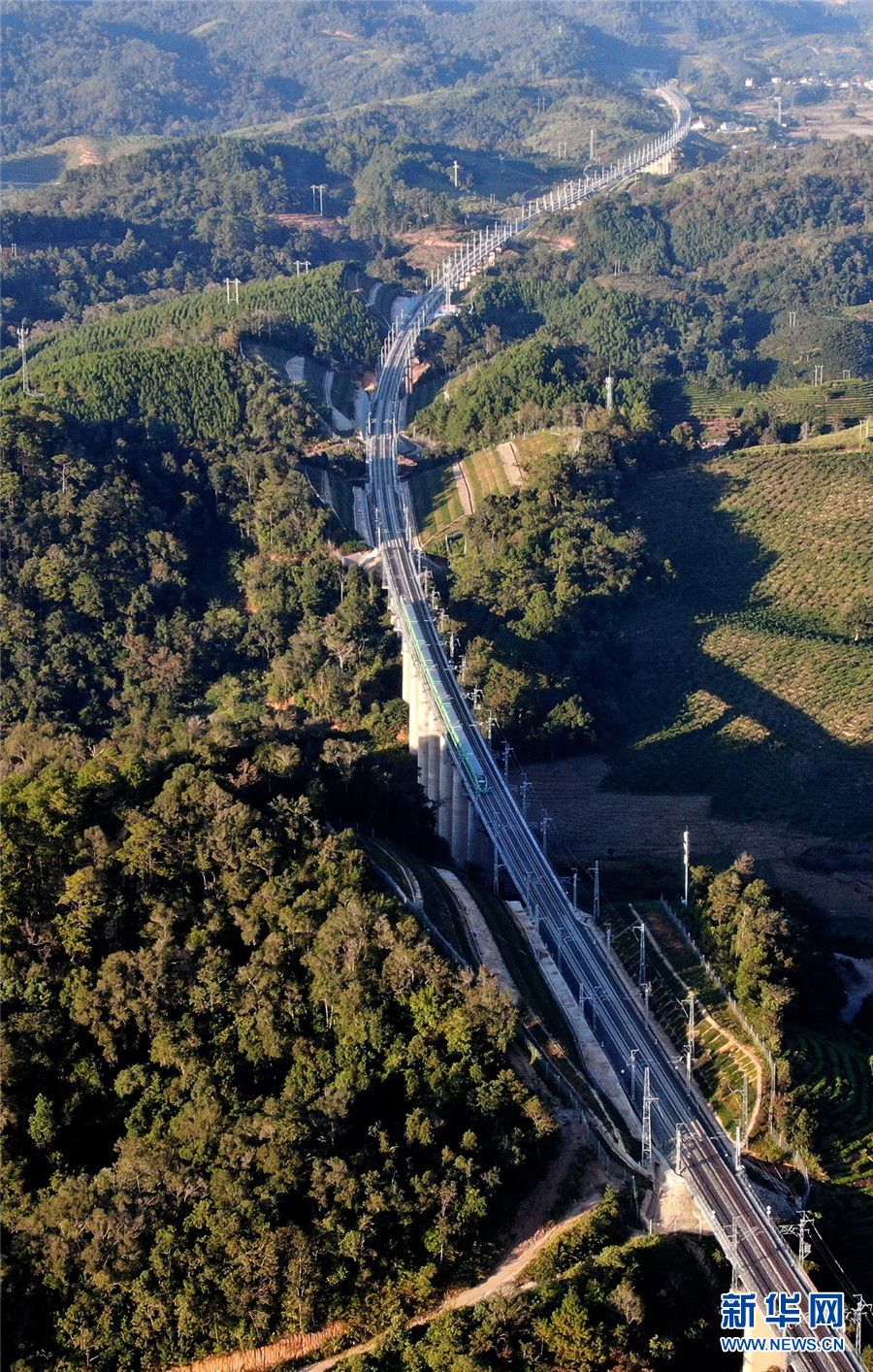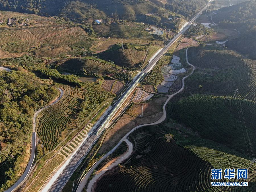 (12月8日,一列动车在云南省西双版纳傣族自治州境内的中老铁路路段上飞驰,铁路两边是森林和茶园(无人机照片)。)