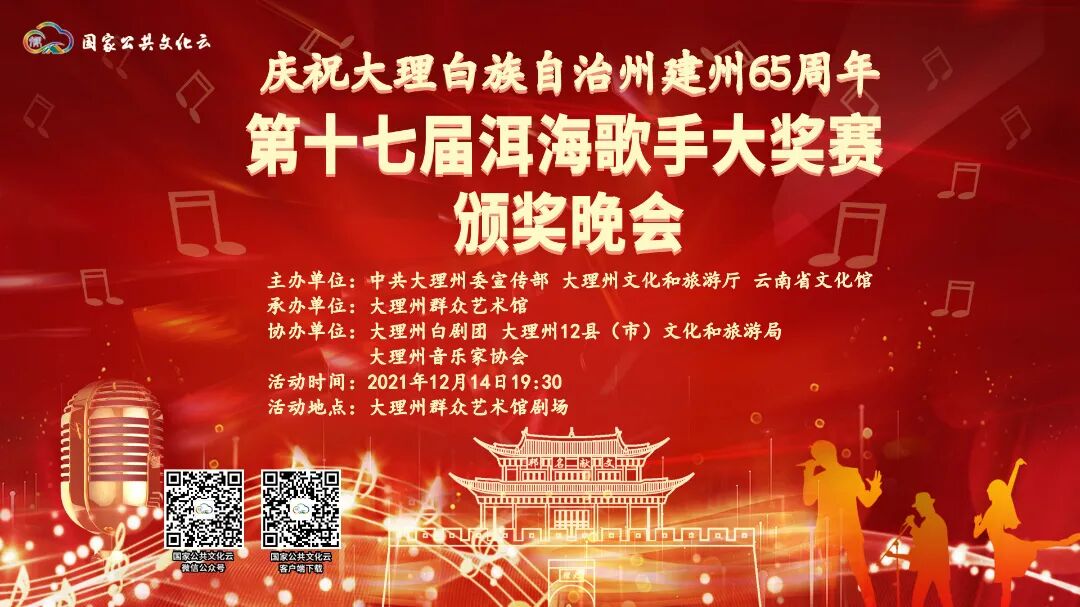 2021年12月14日 19:30,由中共大理州委宣传部、大理州文化和旅游局、云南省文化馆主办,大理州群众艺术馆承办的庆祝大理白族自治州建州65周年——第十七届《洱海歌手》大奖赛颁奖晚会将在大理州群众艺术馆剧场举行。