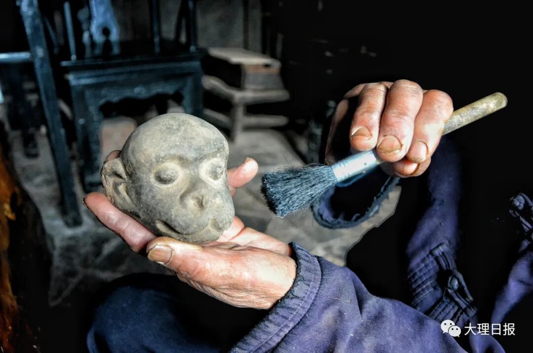 12月4日,黄永寿在为家传脸谱模具——猴头除尘。
